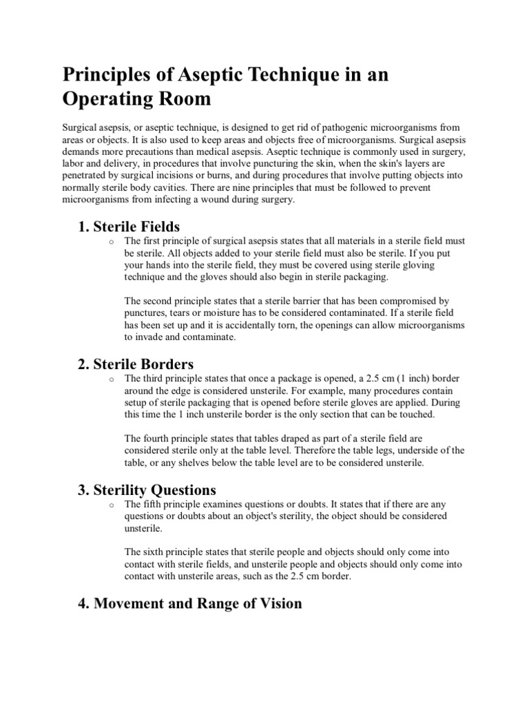All the content of this work reflects his personal knowledge about 13 principles of aseptic technique in operating room and can be used only as a source for writing a similar paper. The minimum distance which a nonsterile person should remain from a sterile field is. To minimize cross contamination between the operating room and other areas of the hospital. Principles of sterile technique all articles used in an operation have been sterilized previously.